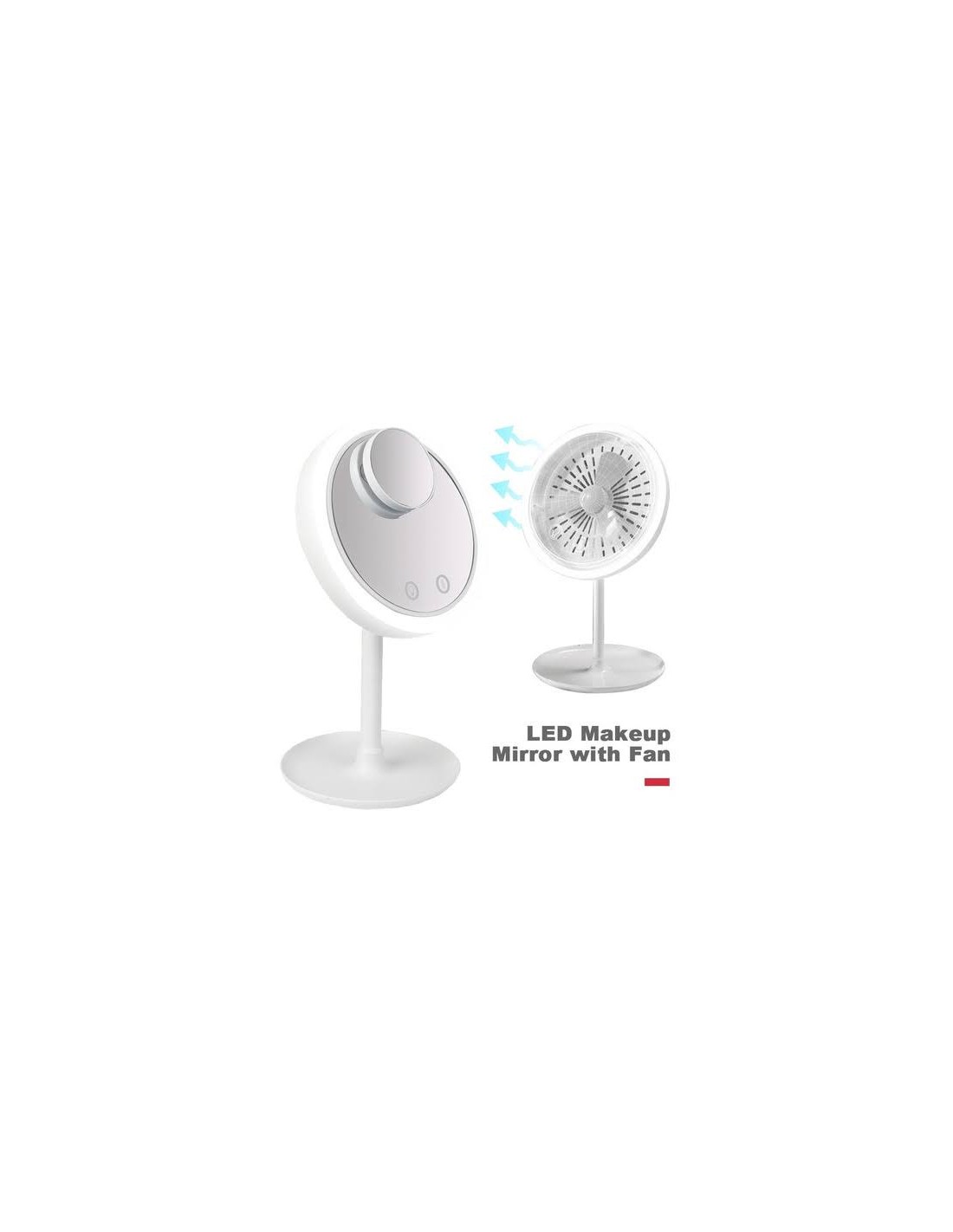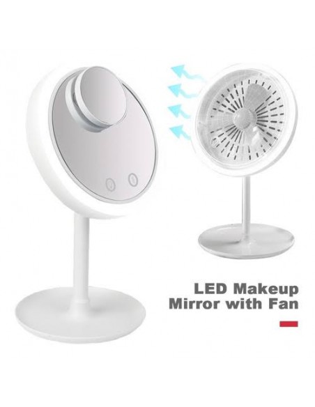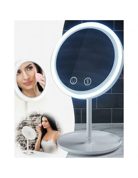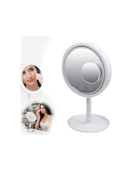 Espejo cosmético con luz led y ventilador incorporado que funciona con batería y con cable USB. Este espejo además trae espejo accesorio de 5x para zonas pequeñas y detalles.