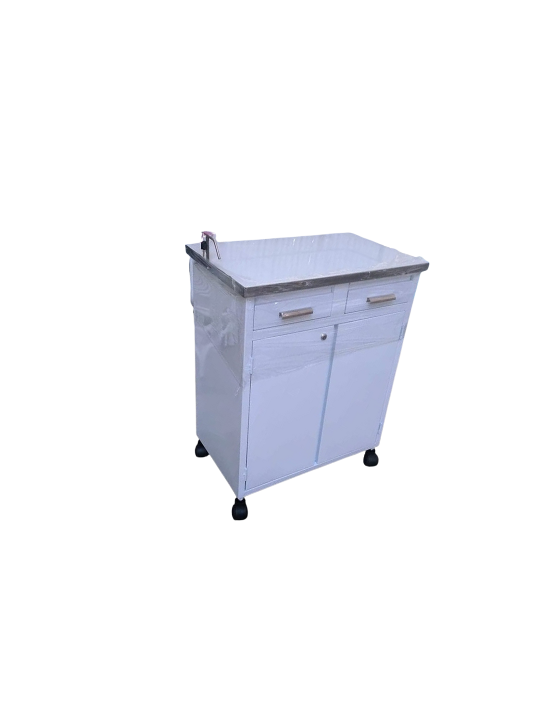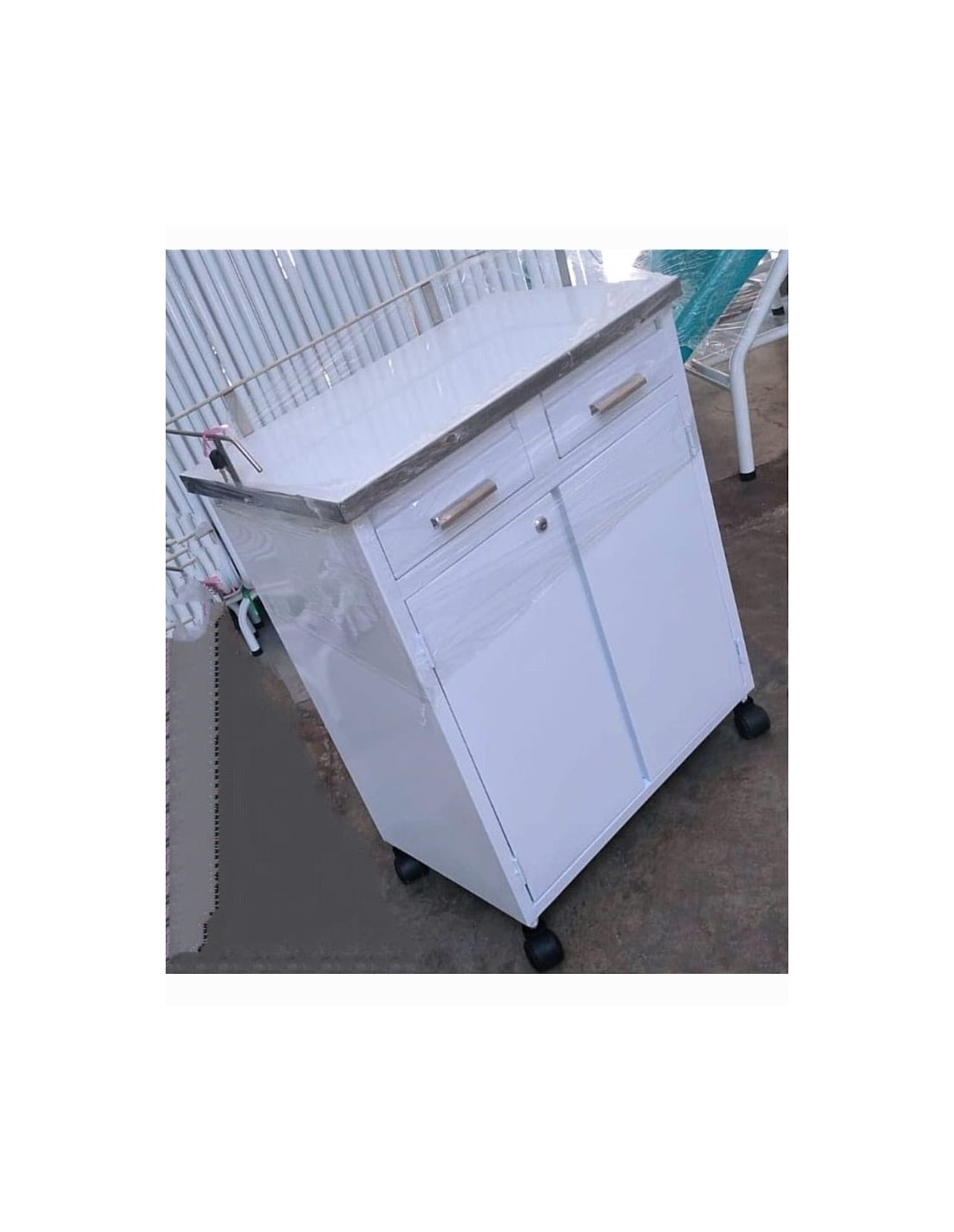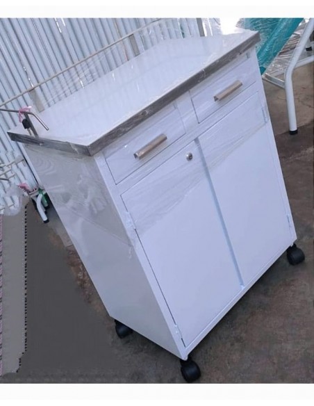 Coche de curaciones. Mesa auxiliar para aparatología con ruedas. Liviana pero resistente. Soporta hasta 25 kilos. Tiene 2 cajones y una bandeja inferior.