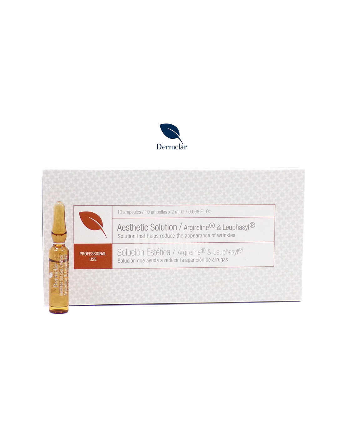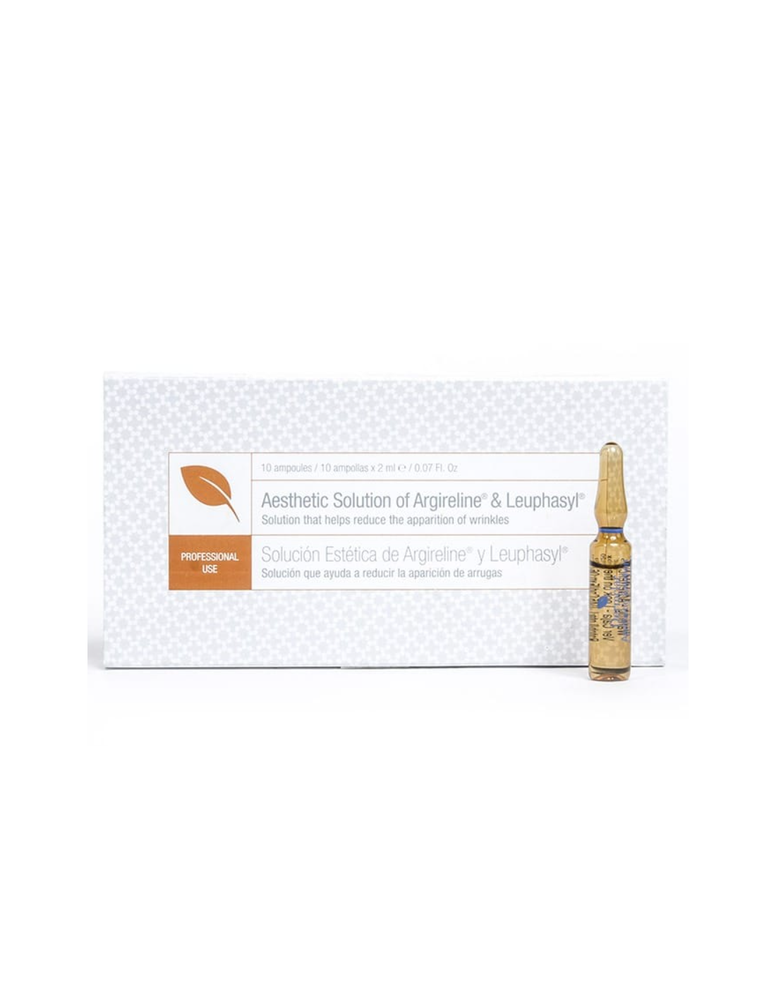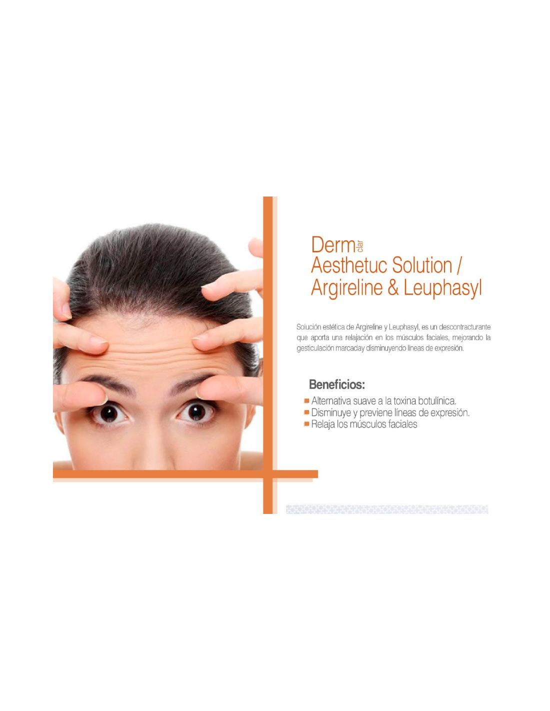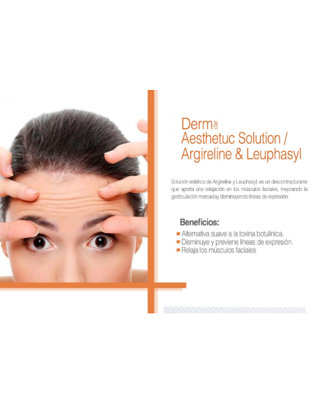 Solución Estética de Argireline y Leuphasyl, es un descontracturante que aporta una relajación en los músculos faciales mejorando la gesticulación marcada y disminuyendo líneas de expresión.